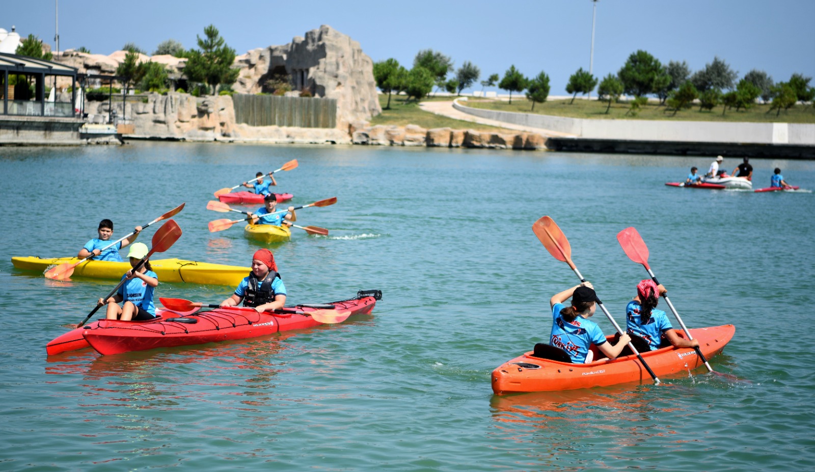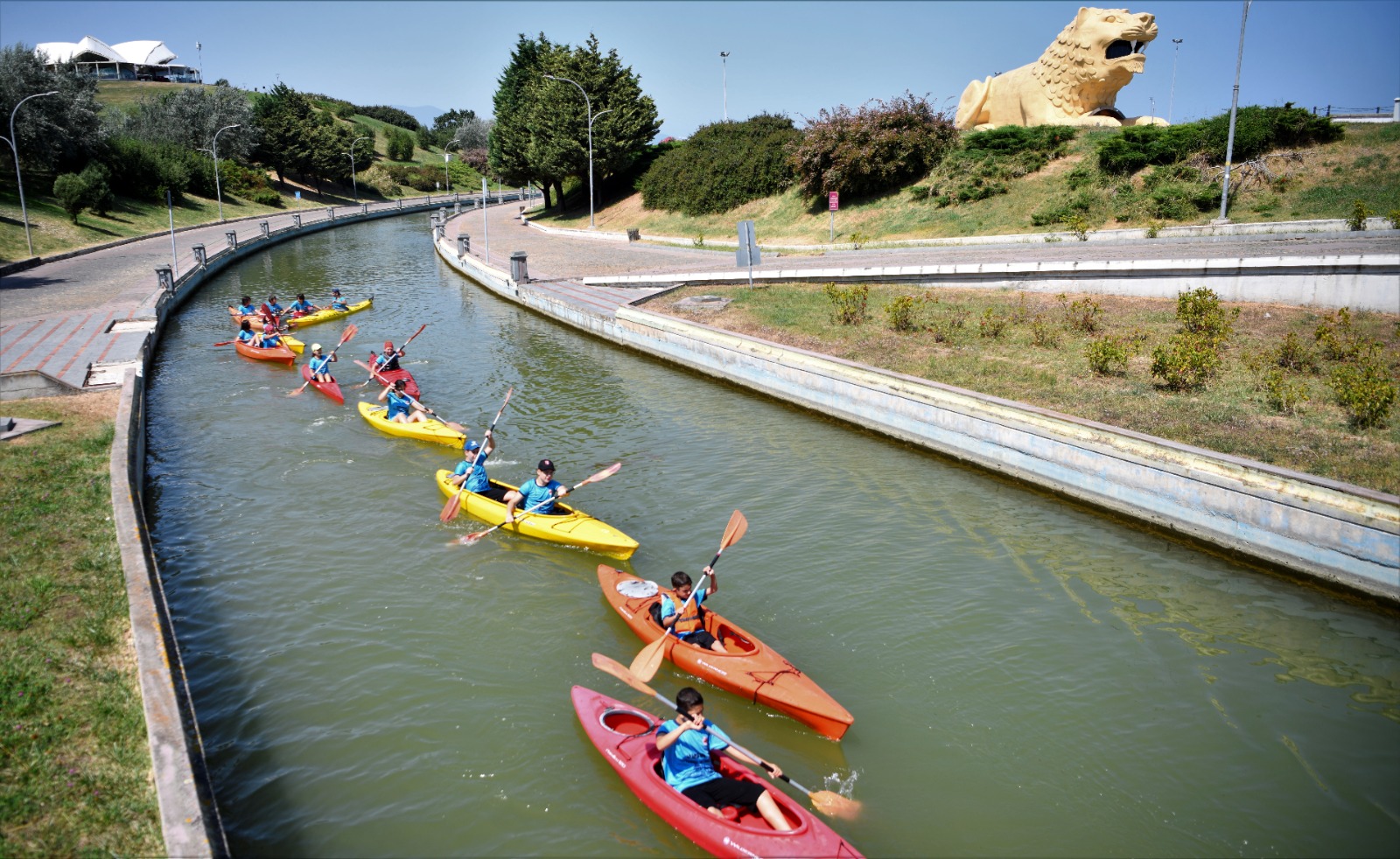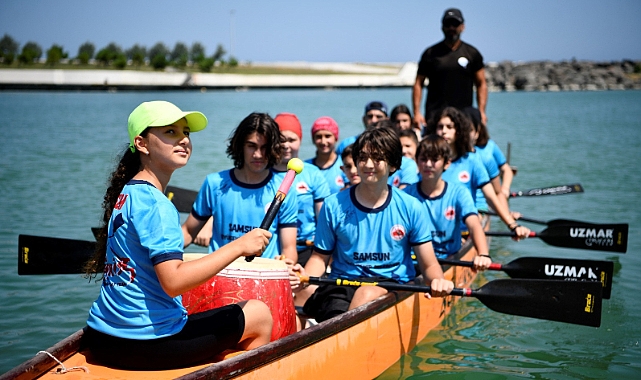 Samsun Büyükşehir Belediyesi’nin bu yıl futbol, basketbol, voleybol, eskrim, badminton, güreş, boks, halter, tekvando, kick boks, atletizm, kano ve yelken branşlarında açtığı kurslara 7-16 yaş arasında binin üzerinde öğrenci katılıyor. Belediyenin Anakent spor Kulübü bünyesinde açılan yaz spor okulunda 10-18 yaş arası öğrencilere kano ve dragon bot eğitimi veriliyor. Yaz tatillerini Batı Park Su Sporları Tesisi’ndeki eğitimlere katılarak değerlendiren 30 öğrenci, teorik bilgilendirmelerin ardından suyla buluşuyor. Yoğun efor sarf etmelerine rağmen antrenmanlarda stres atarak motivasyonlarını yükselten gençler, fiziklerini de güçlendiriyor. Genç dragon botçular, Cumhuriyet’in 100 yılı anısına Samsun’un ev sahipliğinde yapılacak 29 Ekim Dragon Bot Şampiyonası’nda mücadele edecek. Yaşı büyük sporcularla yarışacak Samsun Büyükşehir Belediyesi’nin Gençler Dragon Bot Takımı, şampiyonluğu hedefliyor. Haftanın 3 günü tesislere gelen öğrenciler, güne fizik kondisyon hareketleriyle başlıyor. Amazon Kanalı’nda kanolarıyla alıştırma yaptıktan sonra da 1 davulcu ve 16 kürekçiden oluşan takım, antrenörleri eşliğinde çalışıyor.
