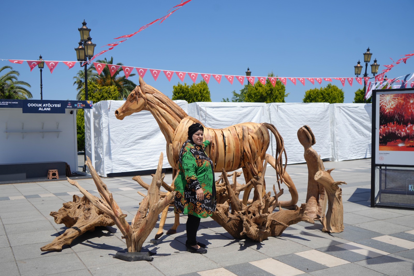 İnsanların eserlerine oldukça fazla ilgi gösterdiğini de ifade eden Korkmaz, “Ağaca şekil vermek, farklı bir çalışma gerektiriyor. Yapacağım sanat eserlerinde benzeteceğim hayvanların malzemelerini doğadan topluyorum. Ağaçlara çok müdahale etmek istemiyorum. Örneğin doğada atın kuyruğuna ya da ayağına benzer bir parça bulursam alıyorum. Samsunluyum. Festival başladığından beri de Kurtuluş Yolu Sergi Alanındayım. Hakikaten insanların yaptığım eserlere ciddi anlamda ilgisi var” diye konuştu.