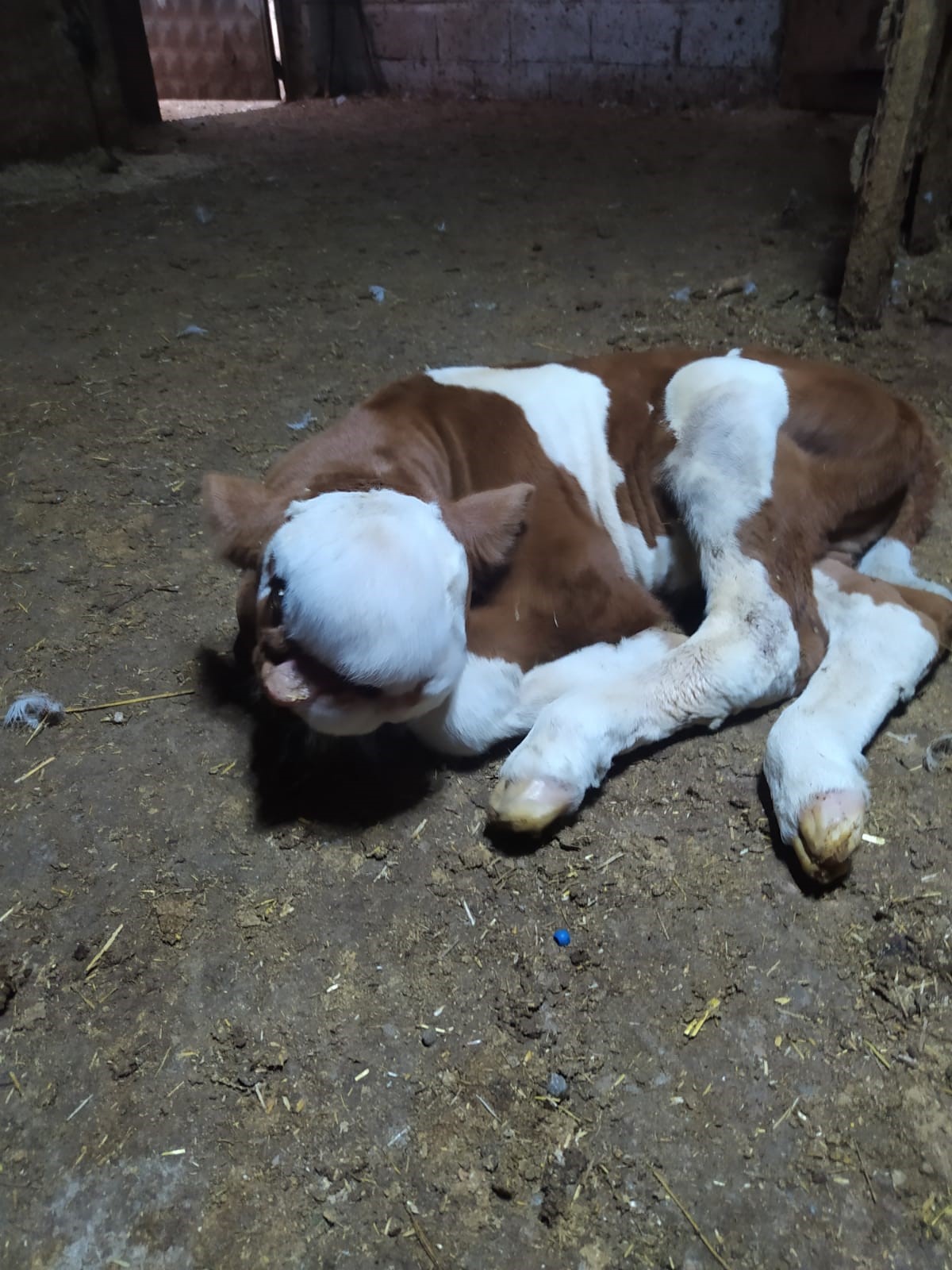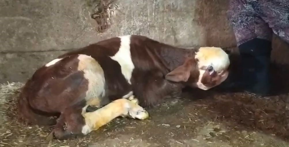 Buzağının kafa yapısının normalden çok farklı olduğunu gören besici, o anları kayda aldı. Polat, çene yapısı oluşmayan ve kafatası kemiği bulunmayan buzağıyı görür görmez veterineri aradı.
