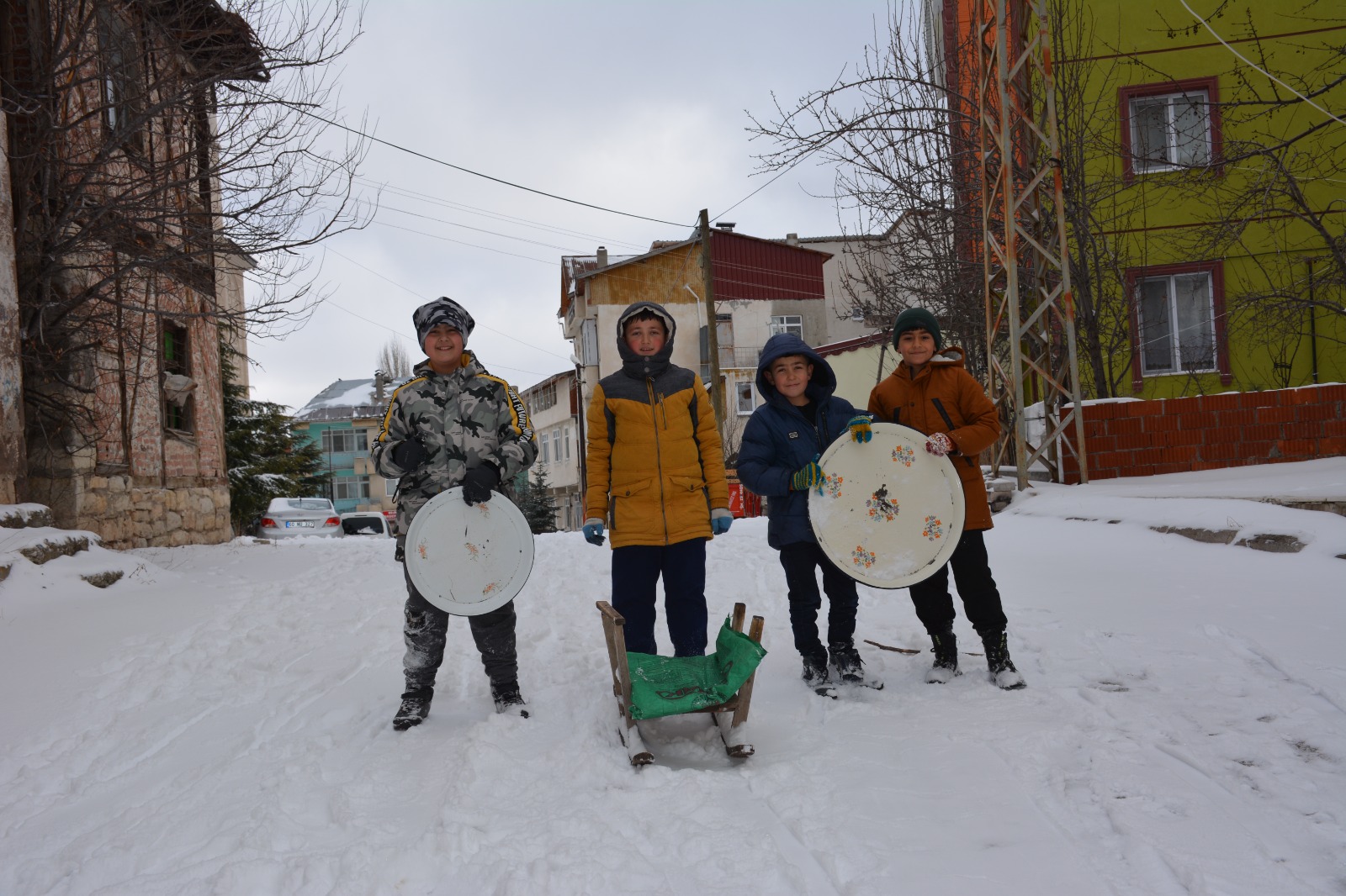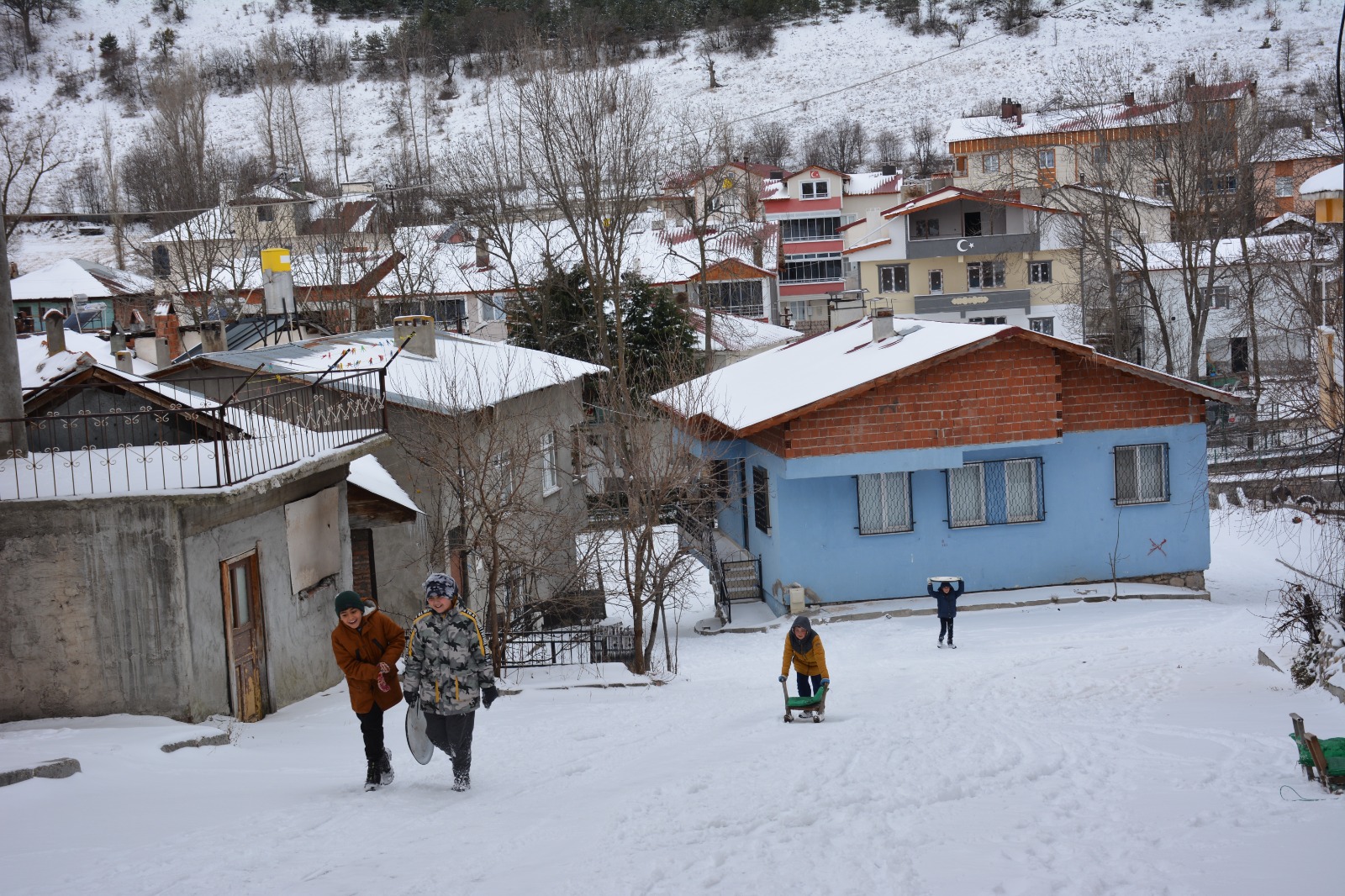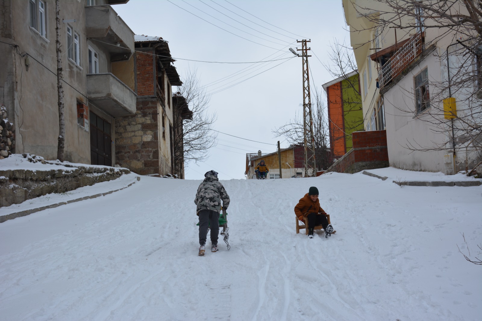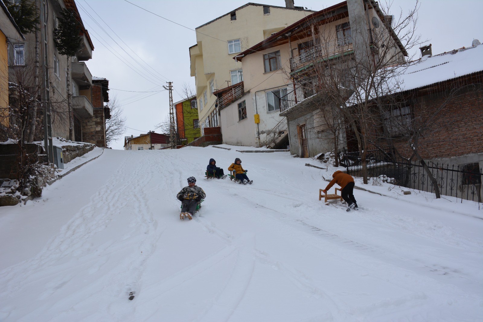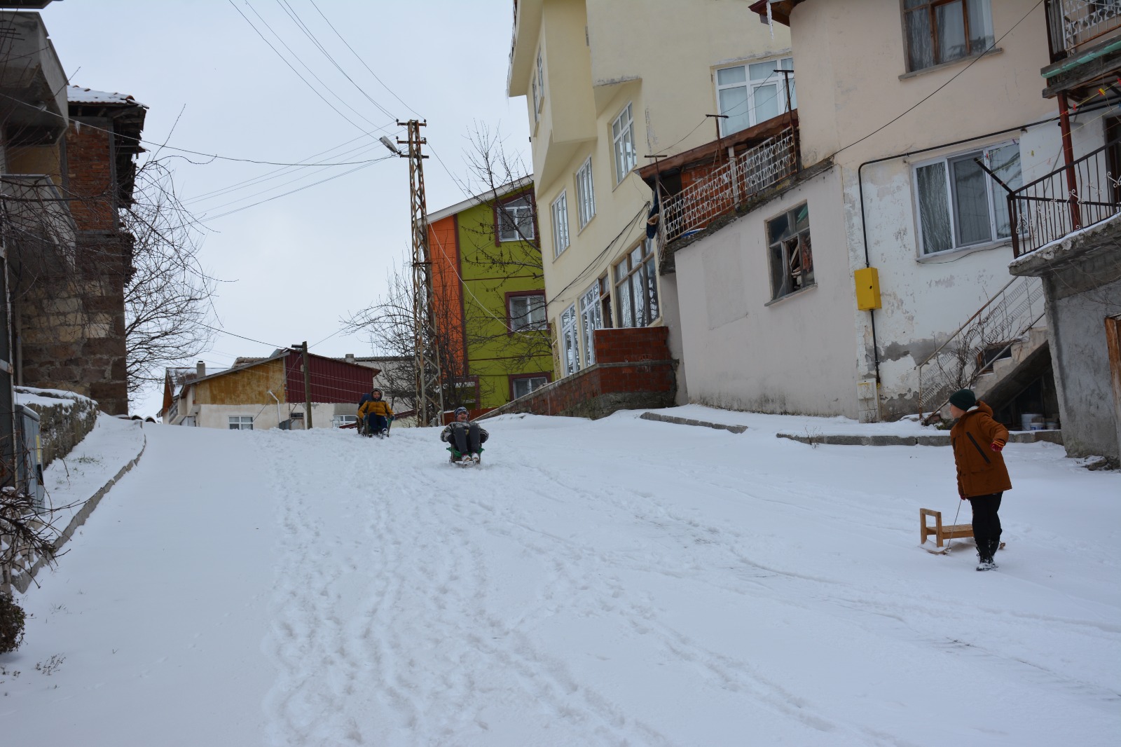 Çocuklar, yağışın ardından kızaklarla cadde ve sokaklarda kayarak keyifli vakit geçirdi.