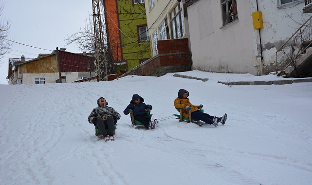 Uzun zamandır kar yağmasını beklediğini belirten Mustafa Enes Açıkel, kızak yaparak arkadaşlarıyla eğlendiğini ifade etti.