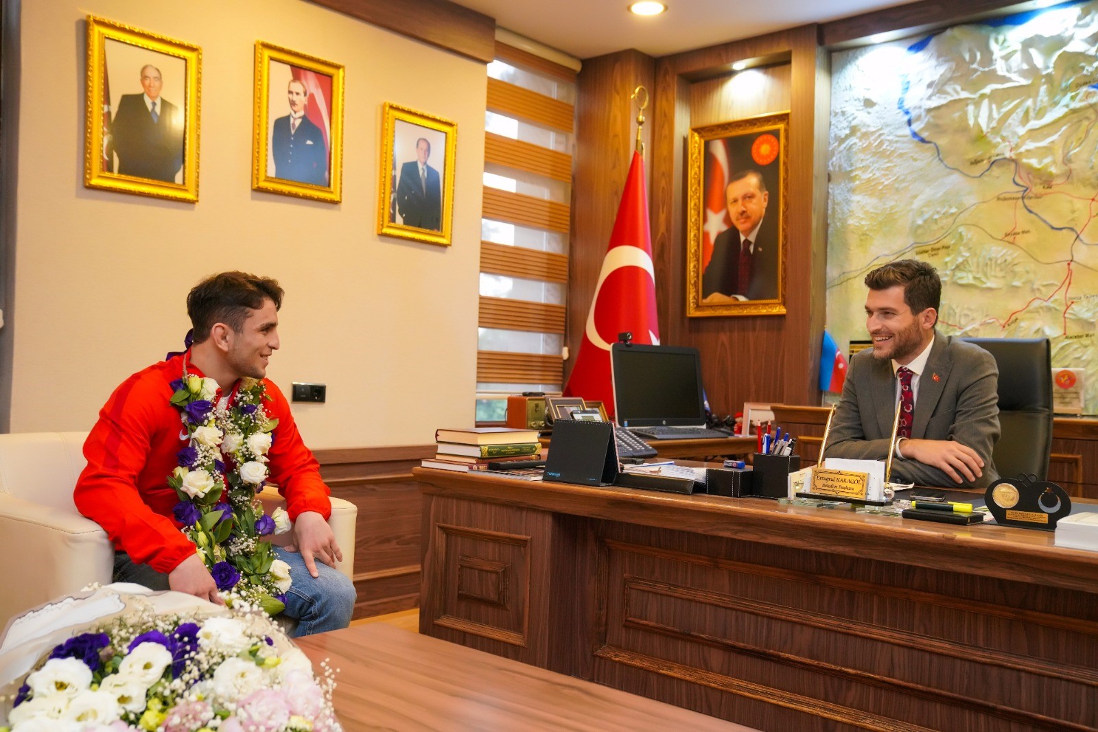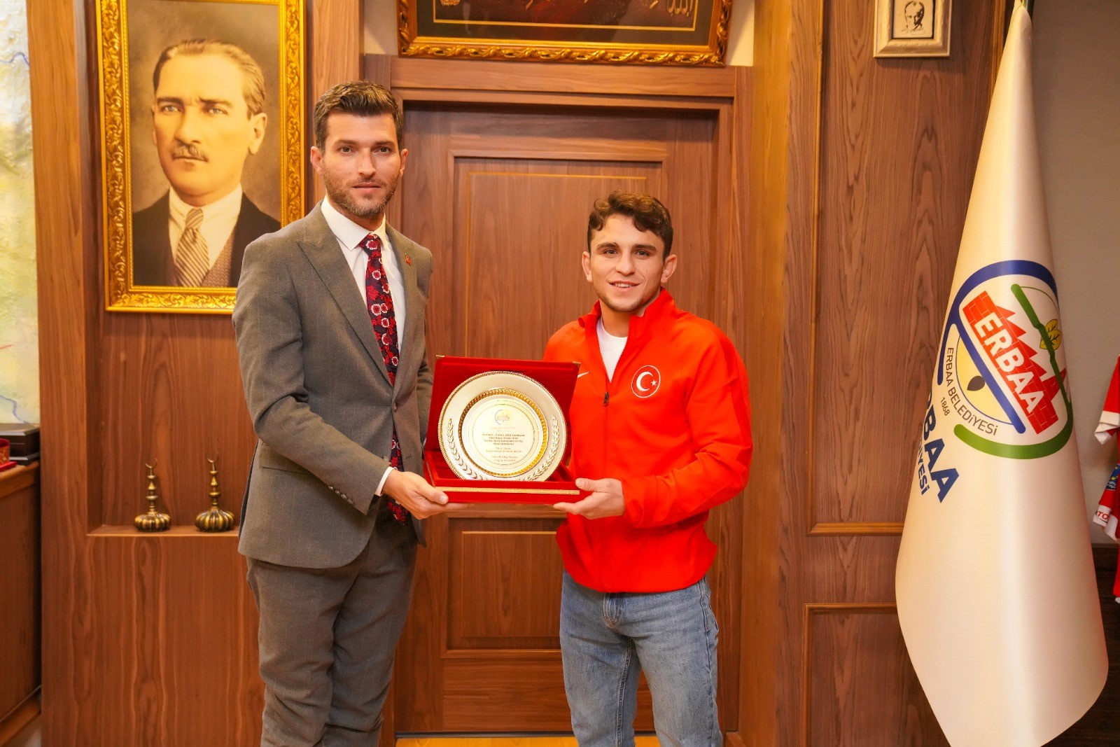 Azerbaycan’ın başkenti Bakü’de düzenlenen Ordulararası Serbest Güreş Şampiyonasında Türk Silahlı Kuvvetlerini temsil eden Erbaalı Güreşçi Ahmet Duman Azerbaycanlı rakibini mağlup ederek Dünya Şampiyonu oldu. Erbaa Belediye Başkanı Ertuğrul Karagöl, Gençlik ve Spor İlçe Müdürü Raif Ünal ile birlikte şampiyonanın ardından memleketi Erbaa’ya dönen başarılı sporcuyu makamında ağırladı. Duman’ı tebrik eden Başkan Karagöl başarılı sporcuya hediye takdim etti.