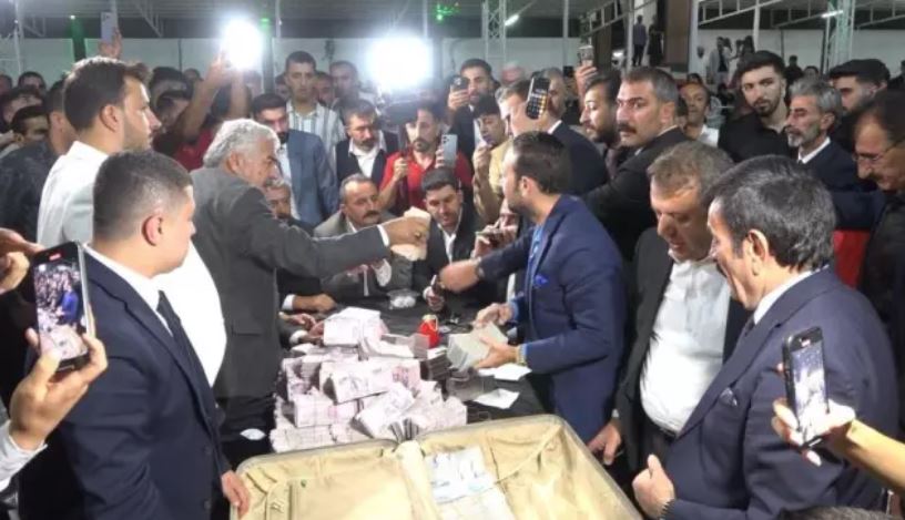 2 ton etli yemeğin dağıtıldığı düğün törenine Aşiret liderleri, kanaat önderleri, STK başkanları, iş adamları ve çok sayıda davetli katıldı. 4 saat süren ve yaklaşık 20 kişinin saydığı takı töreninin sonunda damada 15 milyon TL, geline ise 2 kilo altın takıldı. Toplanılan paralar bavullara konularak taşınırken, takı töreninin ardından yüzlerce kişi halay çekti.