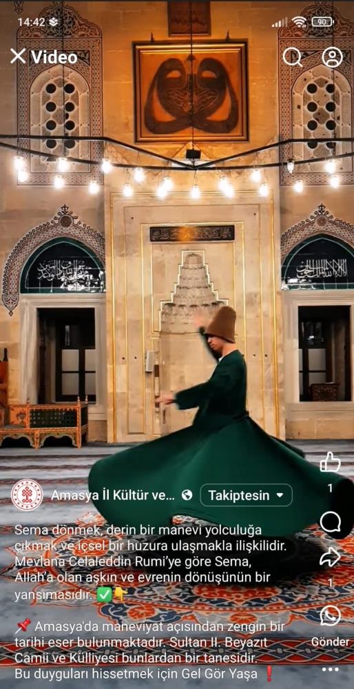 Amasya İl Kültür ve Turizm Müdürlüğü, Sultan II. Bayezid Camii'nin içerisinde seslendirilen ilahi eşliğinde sema gösterisi yapan semazenin görüntüsünü sosyal medya hesabından paylaştı. Paylaşımda, "Sema dönmek, derin bir manevi yolculuğa çıkmak ve içsel bir huzura ulaşmakla ilişkilidir. Amasya'da maneviyat açısından zengin bir tarihi eser bulunmaktadır. Sultan II. Beyazıt Camii ve Külliyesi bunlardan bir tanesidir. Bu duyguları hissetmek için gel gör yaşa" ifadeleri kullanıldı.