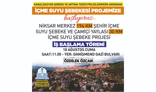 Niksar Belediye Başkanı Özdilek Özcan, niksar Merkez 194 km Şehir İçme Suyu Şebeke ve Çamiçi Yaylası 30 km İçme Suyu Şebeke Projesinin temellerinin atılmaya başlanacağını duyurdu. 18 Ağustos Cuma günü İş Başlama Töreni ile projenin başlangıcının yapılacağını duyuran Özdilek Özcan Kanalizasyon Şebeke Çalışmalarının ve Artıma Tesisi Projesi sürecinin olumlu olduğunu ve İçme Suyu Şebeke Projesine başlanacağını belirtti.
