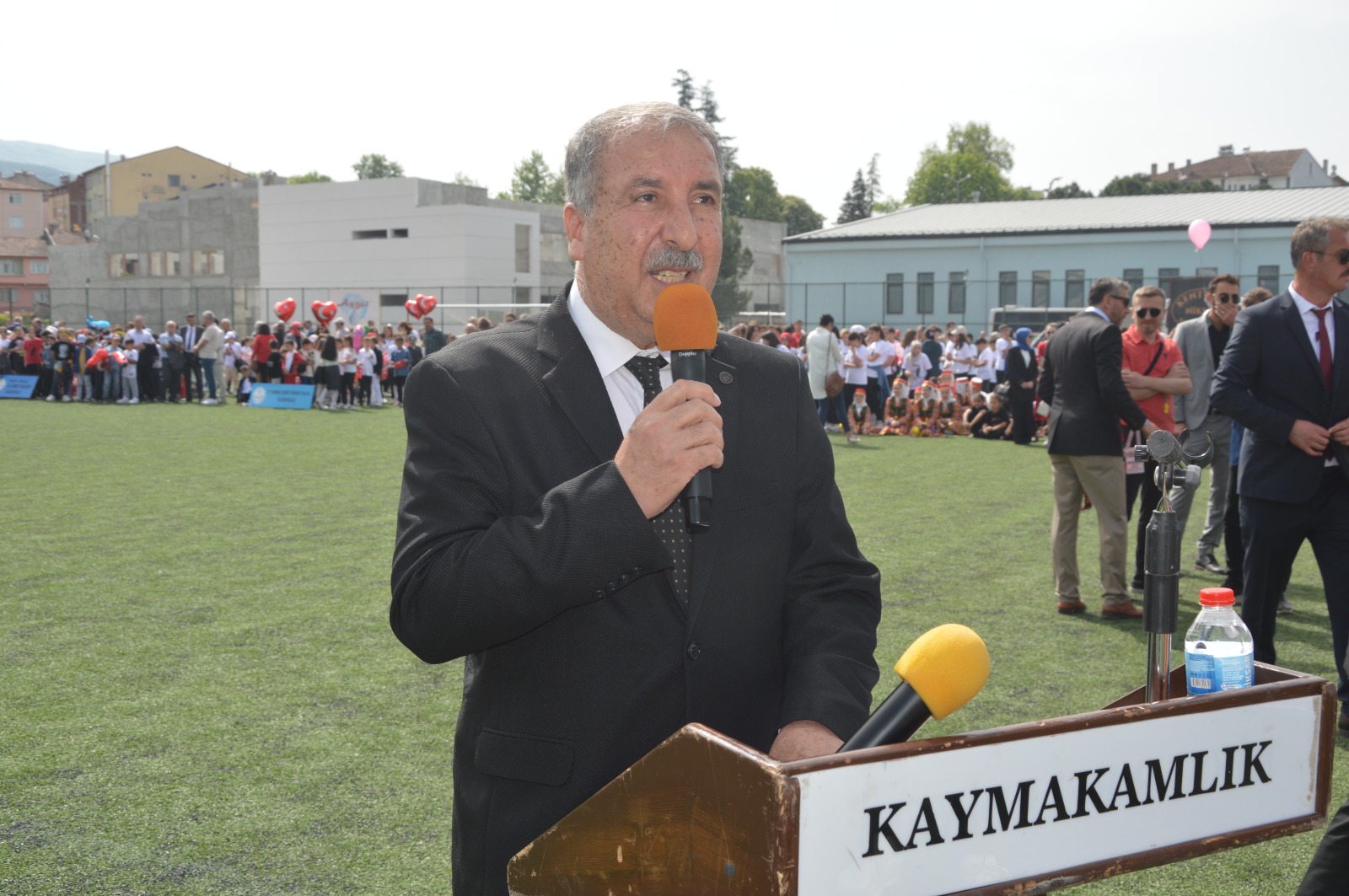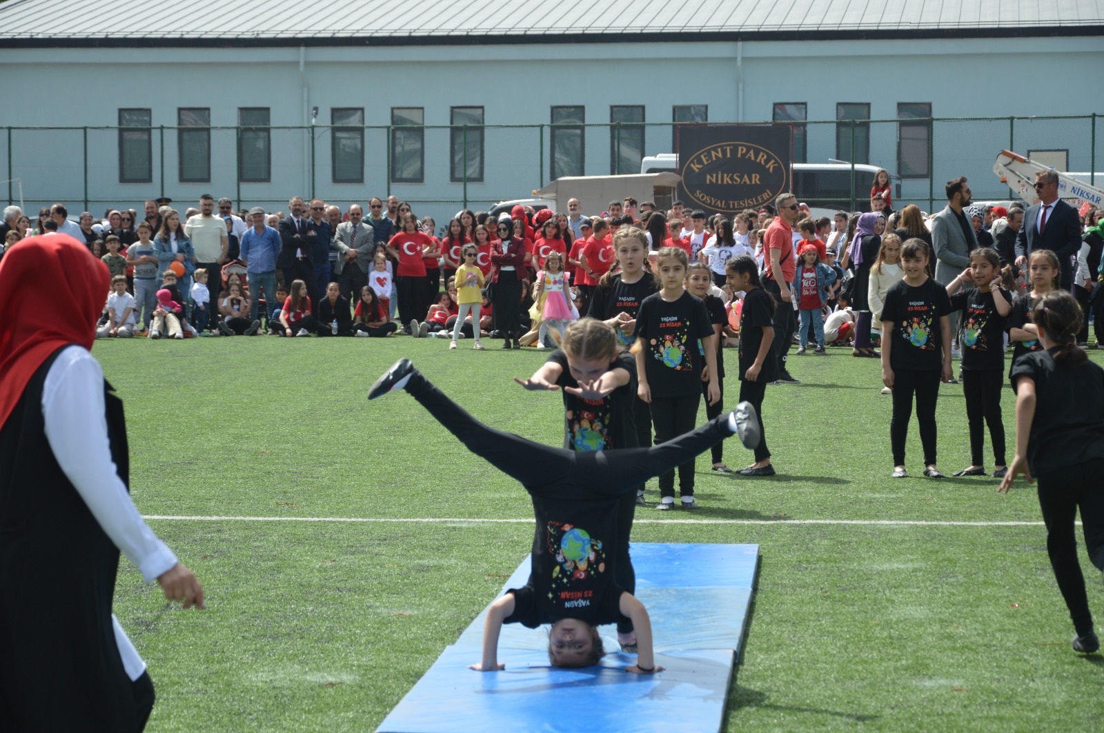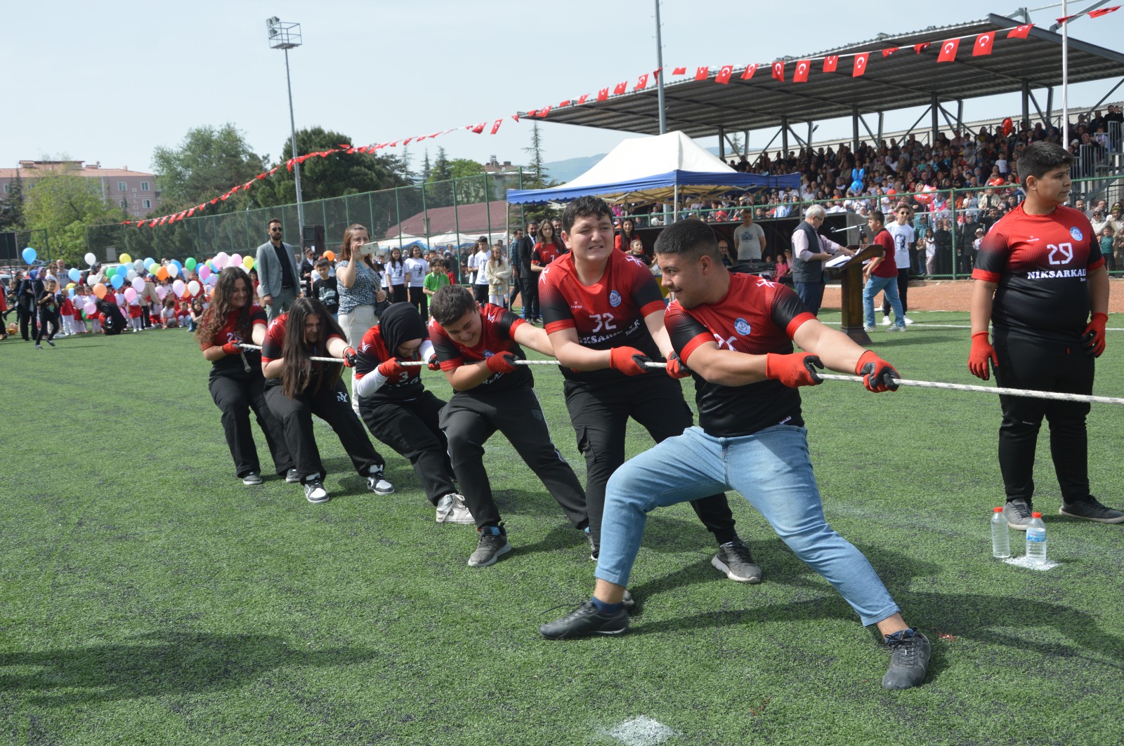 Hükümet konağı önünde çelenk sunma töreninin ardından, İlçe Şehir Stadyumunda devam eden programda Niksar Kaymakamı Ekrem Çeçen ve Belediye Başkanı Semih Tepebaşı öğrencileri ve halkı selamlayarak bayramlarını kutladı.
