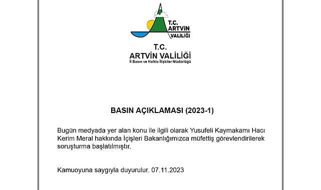Artvin’in Yusufeli ilçesinde görev yapan Kaymakam Hacı Kerim Meral, iddialara göre yemek yediği restoranda döneri beğenmedim diyerek hesabı ödemedi. Konu gündem olurken, İçişleri Bakanlığı tarafından konuyla ilgili soruşturma başlatılırken, Artvin Valiliğinden açıklama yapıldı. Açıklamada, "Bugün medyada yer alan konu ile ilgili Yusufeli Kaymakamı Hacı Kerim Meral hakkında İçişleri Bakanlığımızca müfettiş görevlendirilerek soruşturma başlatıldı. Kamuoyuna saygıyla duyurulur” denildi.