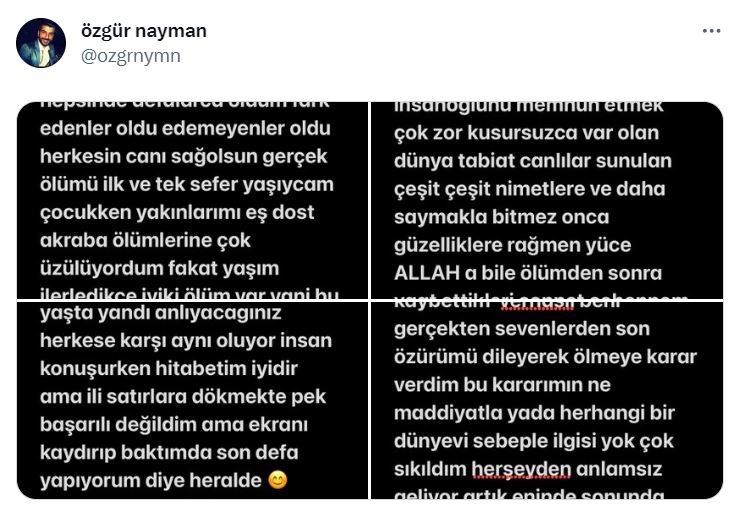 Beyoğlu’nda cinnet getiren şahıs, tartıştığı eşini ve 3 çocuğunu başından vurduktan sonra kendini de vurmuştu. Anne ve 3 küçük çocuk hayatını kaybederken, baba ağır yaralı olarak hastaneye kaldırılmıştı. Özgür N.'ın ailesini öldürdükten sonra sosyal medya hesabında intihar edeceği bilgisini paylaştığı ortaya çıktı. Özgür N., olaydan çok kısa süre önce 'X' hesabından yaptığı paylaşımda, "Böyle bir durumda ne denir? Nereden başlanır kelimelere bilmiyorum. Yaşadığım süre zarfında, duygusal olarak hayal kırıklığı yani insanın üzülüp kırılacağı ne kadar hissiyat varsa hepsinde defalarca öldüm. Fark edenler oldu, edemeyenler oldu. Herkesin canı sağ olsun. Gerçek ölümü ilk ve tek seferde yaşayacağım. Çocukken yakınlarımın, eş, dost, akraba ölümlerine çok üzülüyordum. Fakat yaşım ilerledikçe iyi ki ölüm var, yani bu yalan ve samimiyetsiz sahte hayattan ebedi kurtuluş var diye yaratana şükrettim. Bir düşünün bu hayatı, menfaat ve çıkarlara dayalı hesaplarla, planlarla, açgözlüce ebediyen yaşadığınızı, düşüncesi bile ürkütücü. Konuşurken hitabetim iyidir. Ama işi satırlara dökmekte pek başarılı değildim. Ama ekranı kaydırıp baktım da, son defa yapıyorum diye her halde aklıma gelenleri güzel yazdım diye düşünüyorum. Ne kadar yazsan da her zaman bir şeylerin eksik kalacağını bildiğim, yaşadığım sürece edebiyat yapmayı sevmediğimden bu kadar yeter. Bu kararı almamda tek bir sebep veya neden veyahut da tek bir kişi yok. Beni gerçekten sevenlerden son özrümü dileyerek ölmeye karar verdim. Bu kararımın ne maddiyatla ya da herhangi bir dünyevi sebeple ilgisi yok. Çok sıkıldım her şeyden. Anlamsız geliyor artık. Eninde sonunda öleceğim. Ha bugün ha yarın. Eşimi ve çocuklarımı da çok sevdiğim için onları da bu yalan dünyadan kurtarmak istiyorum. Sevdiklerimi ve beni sevenleri son kez üzeceğim" ifadelerini kullandı.