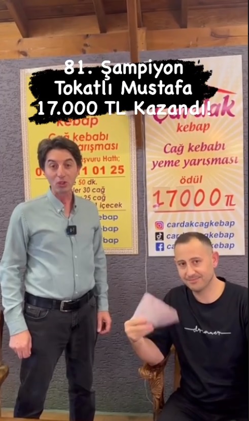 Uzun süredir ödüllü yarışma düzenleyen ve ödül miktarını da günden güne arttıran işletme, bugüne kadar 80 kişiye ödül dağıttı. 80 kişiye ödül dağıttıktan sonra iki hafta boyunca bir kazananın çıkmadığı cağ kebabı yeme yarışmasında ise suskunluğu bir Tokatlı bozdu.