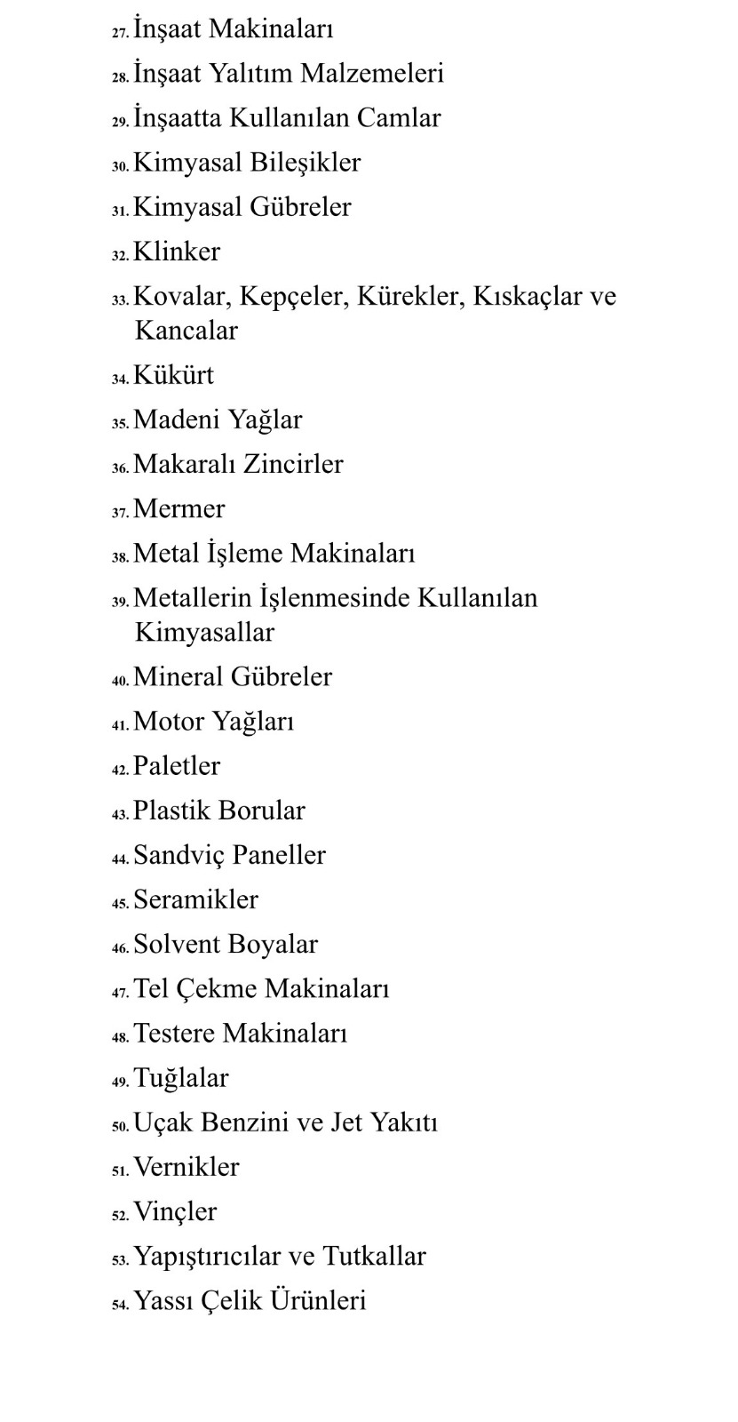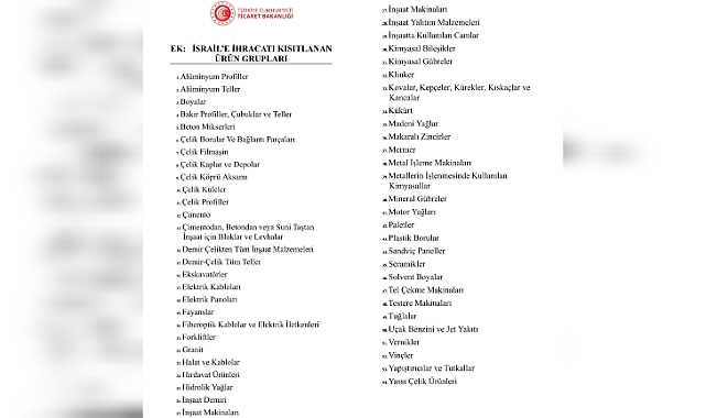 İsrail’e ihracatı kısıtlanan ürünler ise şu şekilde açıklandı: