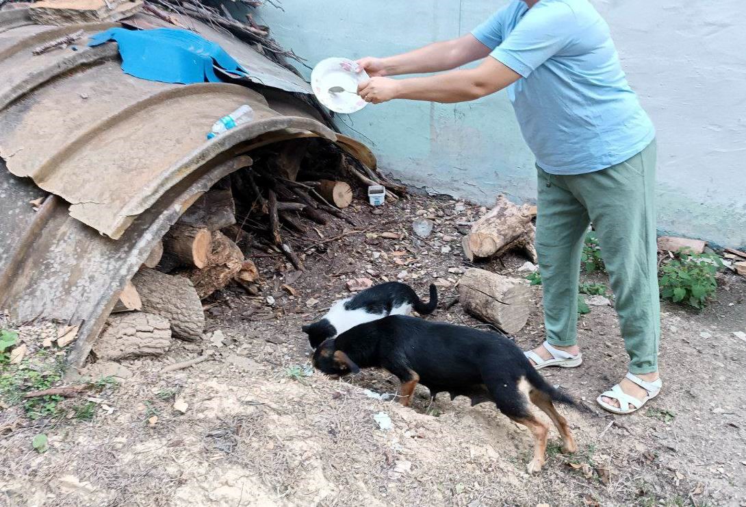 Birlikte yemek yiyen kedi ve köpek, kendilerine ikram edilen yiyecekleri bitirdikten sonra birbirlerinden uzaklaşarak farklı yönlere doğru ilerlediler.