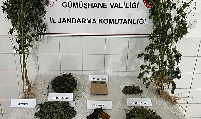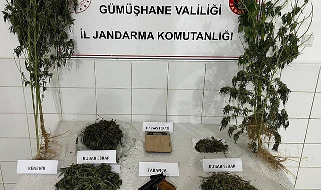 Kelkit Cumhuriyet Başsavcılığından alınan izinle Kelkit İlçe Jandarma Komutanlığı asayiş timleri ve uyuşturucu arama köpeği Delil’in de katılımıyla şüphelinin ev ve eklentilerinde yapılan aramada 4 kök kenevir bitkisi, 1.063 gram kubar esrar, 1 adet hassas terazi, 1 adet tabanca, 1 adet tabancaya ait şarjör ele geçirdi.