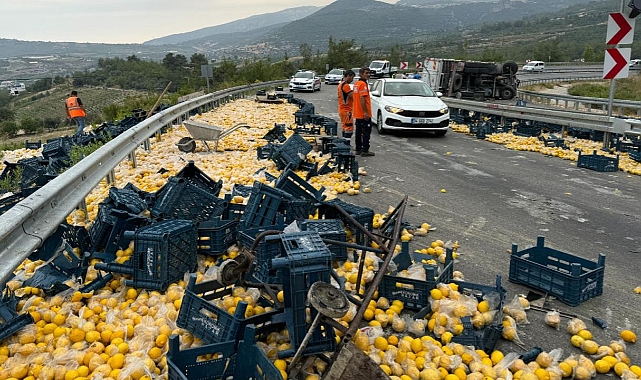 Devrilen kamyon ve yola saçılan limonlar nedeniyle kapanan yol, çalışmaların ardından trafiğe açıldı.