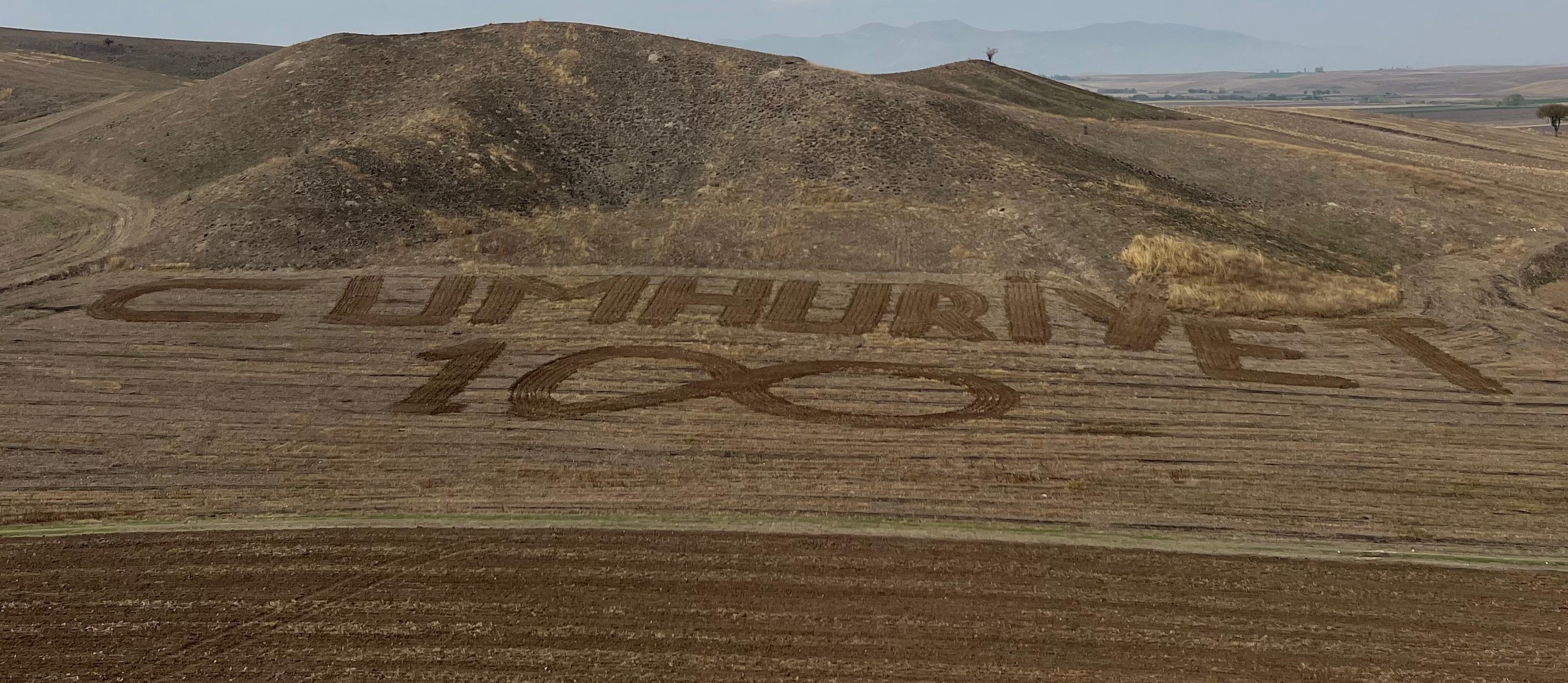 Arazisinde traktörün pulluğuyla iz bırakıp manevralar yapan genç çiftçi, toprağa "Cumhuriyet" yazıp 100 sayısı ve sonsuzluk anlamı taşıyan işareti peşine ekledi. Sonra da eserini karşı tepeden fotoğrafladı.