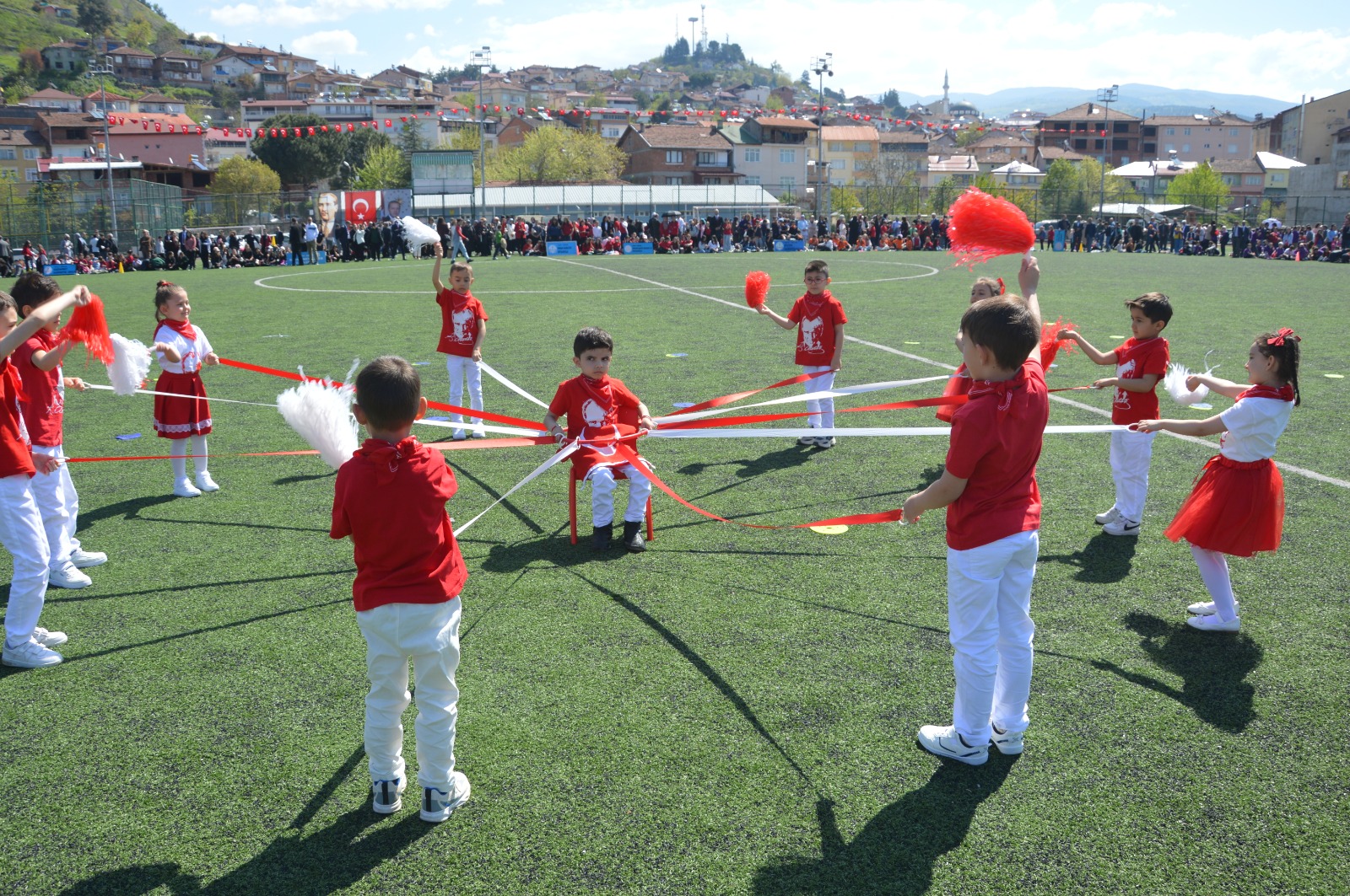 Ödül töreninin ardından ilçe stadı adeta bir festival alanına dönüştü. Toki Ulucan İlköğretim Okulu tarafından düzenlenen ve öğrencilerin uzun süredir hazırlandığı gösteriler izleyenleri büyülerken, geleneksel motiflerin sergilendiği misket ve kaşık oyunu tribünleri coşturdu. Çocukların neşe içinde yarıştığı çuval yarışı ve yumurta yarışı eğlenceli anlara sahne olurken, disiplin ve estetiğin birleştiği jimnastik ve çember gösterileri büyük ilgi gördü.