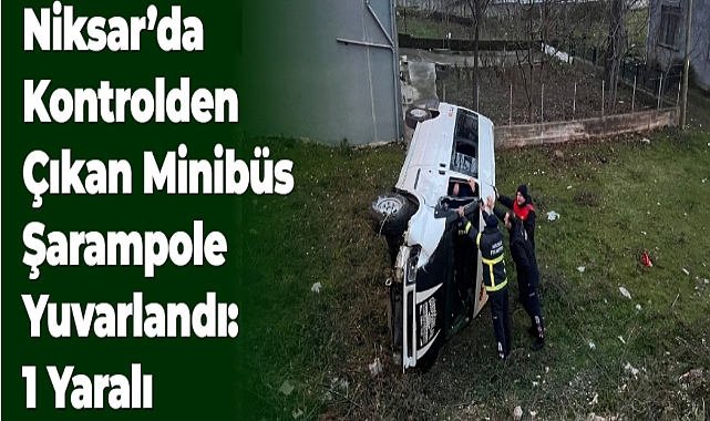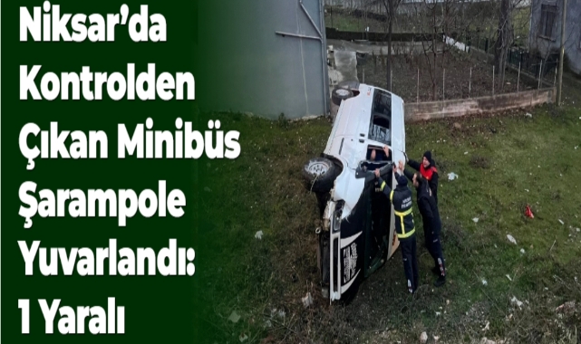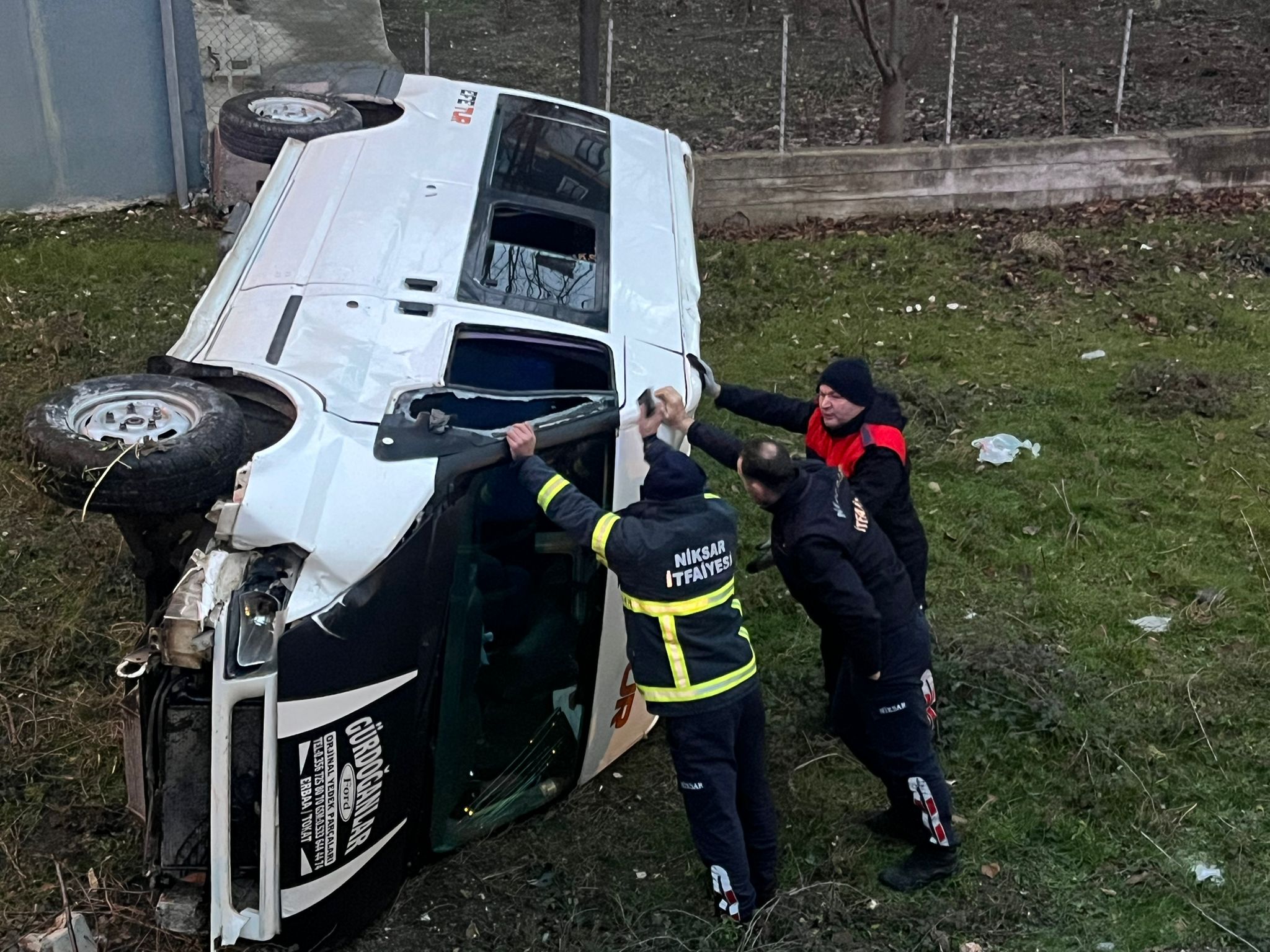 Niksar’da meydana gelen trafik kazasında, kontrolden çıkan transit minibüs yoldan çıkarak boş arsaya yuvarlandı.