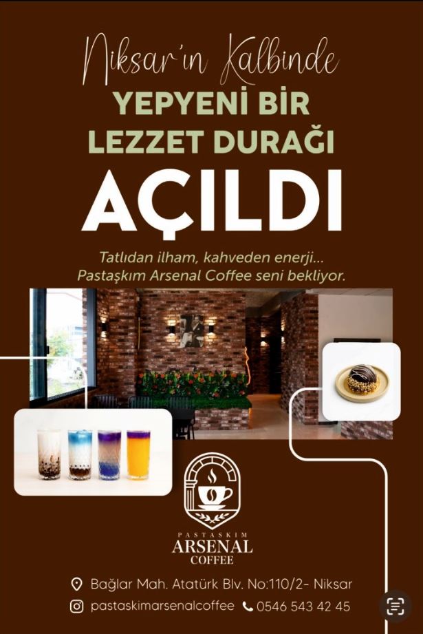 Bağlar Mahallesi Atatürk Bulvarı No:110/2 adresinde kapılarını açan yeni mekân, sıcacık atmosferi, özenle hazırlanan tatlıları ve nefis kahveleriyle şehrin yeni buluşma noktası olmaya aday. Konseptin ismi, tarihi Niksar Roma Arsenalinden ilham alınarak oluşturuldu. Her detayıyla titizlikle tasarlanan işletmede, misafirler hem tatlının keyfini çıkaracak hem de kahvenin enerjisini doyasıya hissedecek.