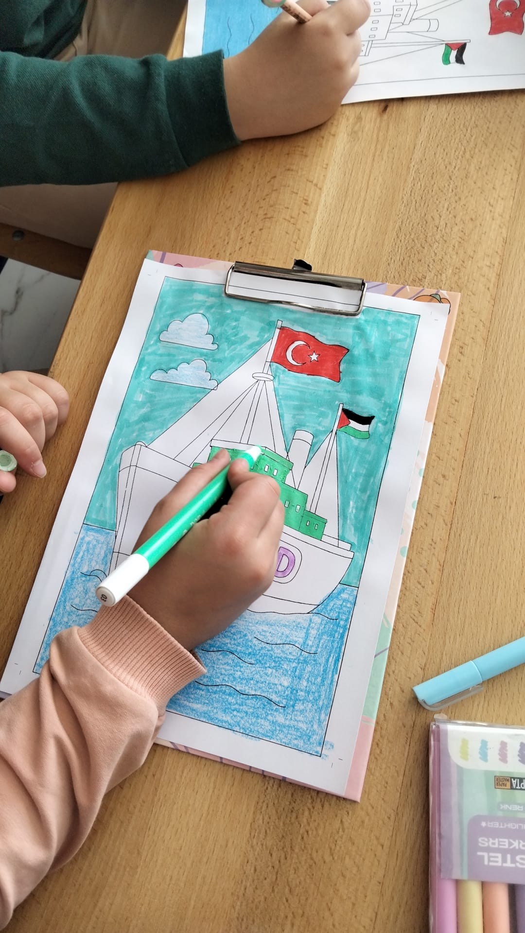 Etkinlikte ayrıca öğrenciler, “Sumud Gemisi” boyama çalışması yaparak Filistin halkının direniş ve umut mücadelesini sanatsal biçimde ifade ettiler. Değerler Eğitimi Kulübü tarafından hazırlanan “Gazze ve Sumud” temalı pano ise öğrencilerin duyarlılığını artırmayı hedefledi.