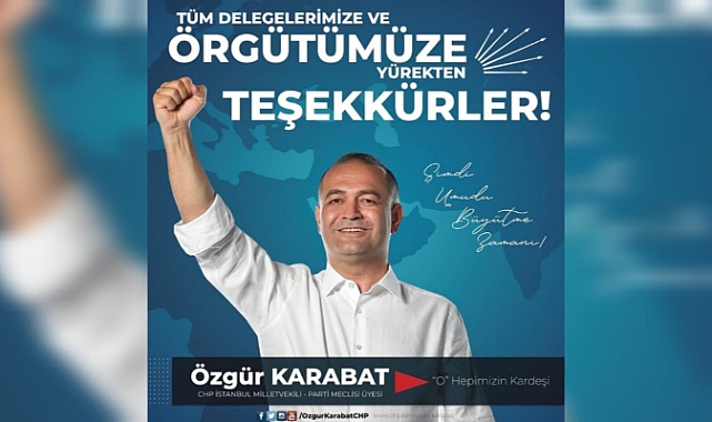 Parti Meclisi’ne ikinci sıradan girdiği için sevincini ve şükranlarını sunan Niksarlı Özgür Karabat, parti delegelerine ve örgüt üyelerine teşekkürlerini iletti. Sosyal medya hesabından bu konuda paylaşım yapan Niksarlı Karabat, “Partimizin 38. Olağan Kurultayında büyük bir destekle 2. sıradan Parti Meclisi üyesi olarak seçilmemi sağlayan tüm delegelerimize ve yol arkadaşlarıma sonsuz şükranlarımı sunuyorum. Her adımı ilmek ilmek örülen bu başarının omzuma yüklediği sorumluluğun bilinciyle, "yüzyılın değişimi ve değişimin yüzyılı" şiarıyla partimizi iktidara taşıma mücadelemizi büyüterek sürdüreceğiz.” sözlerini ifade etti.