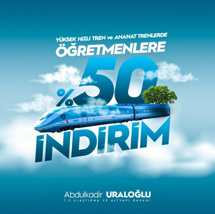 Bakan Uraloğlu, Öğretmenler Günü dolayısıyla yüksek hızlı tren (YHT) ve Anahat Trenlerinde tam bilet ücreti üzerinden öğretmenlere bilet alımında yüzde 50 indirim uygulanacağını duyurdu. Uygulamanın 24-30 Kasım 2024 tarihleri arasında geçerli olacağını ifade eden Bakan Uraloğlu, “24 Kasım Öğretmenler Günü nedeniyle 24-30 Kasım tarihleri arasında Yüksek Hızlı Tren (YHT) ve anahat trenlerinde tam bilet ücreti üzerinden öğretmenlerimize %50 indirim uyguluyoruz.