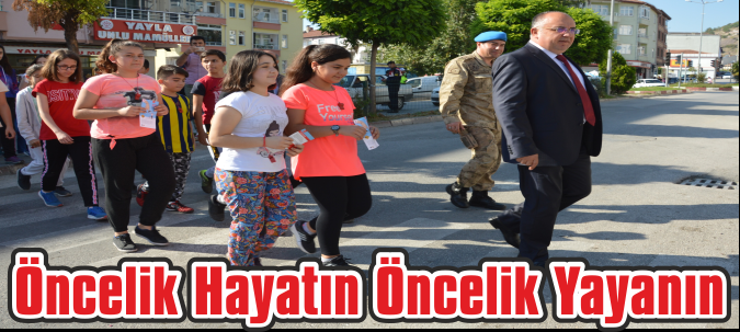 Kaymakam İlhami Doğan öğrencilerle birlikte yaya geçidinde bekleyerek, seyir halindeki araçları durdurup sürücülere trafikte uyulması gereken bilgilerin bulunduğu broşürlerden dağıttı.