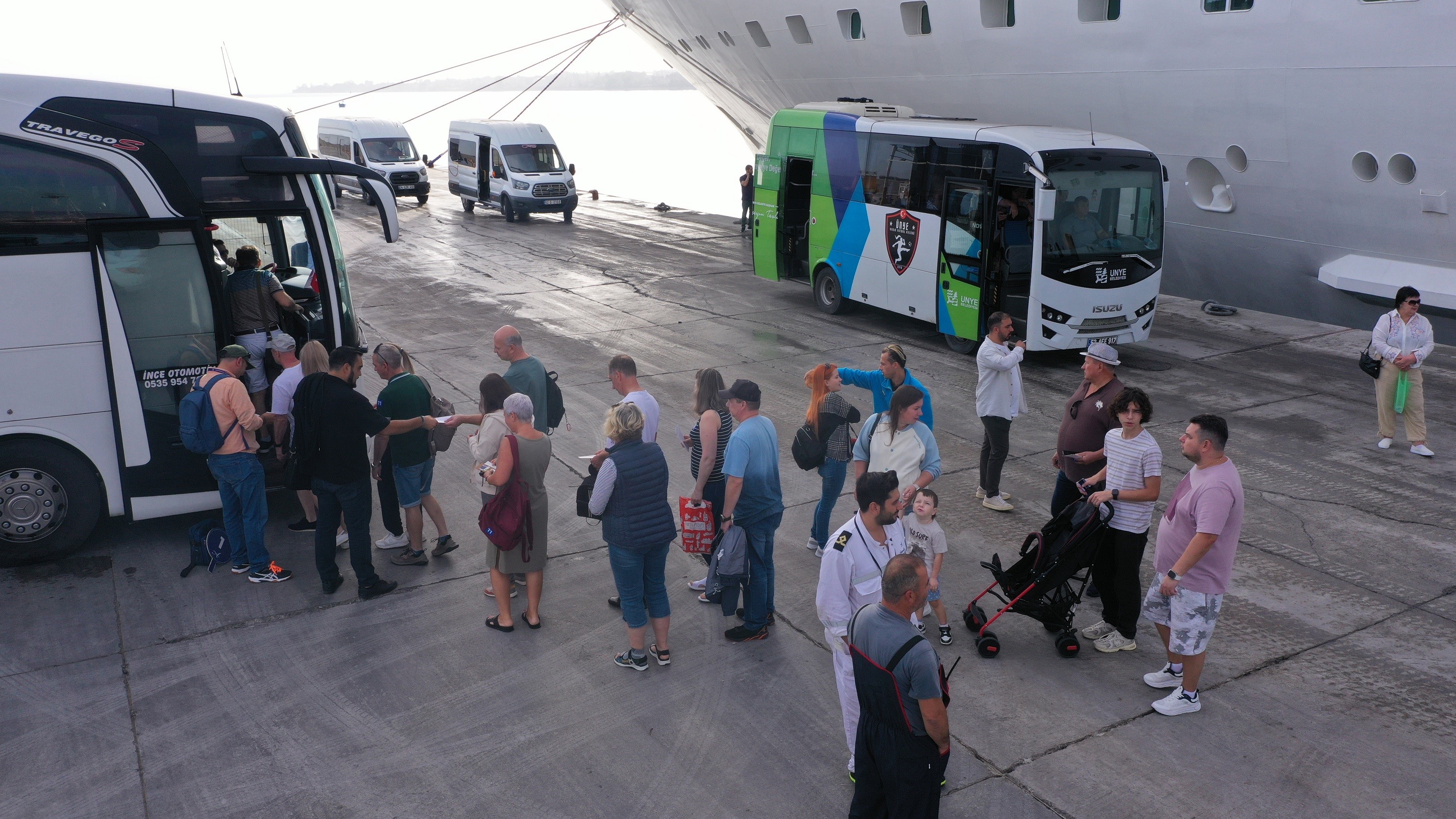 Rusya’nın Soçi limanından demir alan ve trabzon üzerinden Ordu’ya gelen dev Cruise gemisi Ünye Limanına demir attı. gemi ile gelen yüzlerce turist, Ünye, fatsa ve Altınordu ilçeleri başta olmak üzere şehrin tarihi ve doğal güzelliklerini gezerek bol bol alışveriş yapabilme imkanı buluyor. Ünye Limanına demirleyen Cruise gemisi 2024 yılında da seferler düzenlemeye devam edecek.