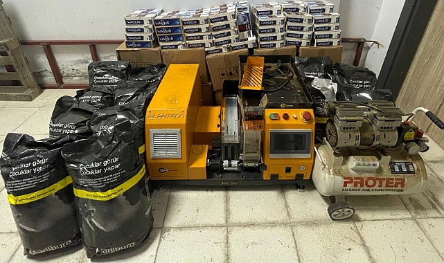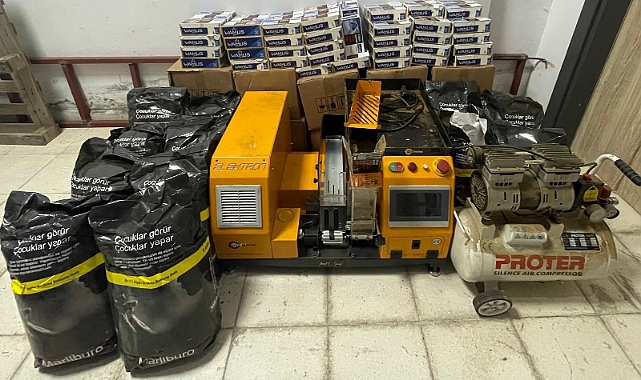 Yapılan aramada, 20 bin adet makaron sigara, 1 adet elektrikli sigara sarma makinesi, 1 adet kompresör ve 55 kilo kaçak tütün ele geçirildi.