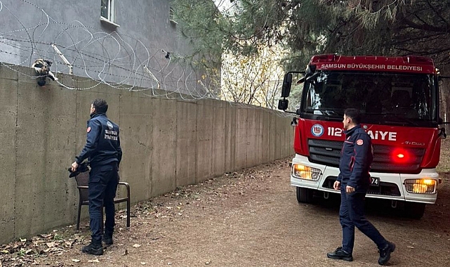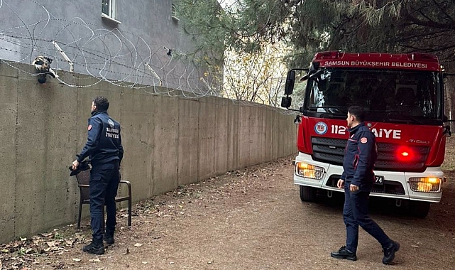 Samsun Büyükşehir Belediyesi İtfaiye Dairesi Başkanlığı ekipleri kısa sürede komutanlık yerleşkesine gelerek kediyi mahsur kaldığı yerden kurtardı.
