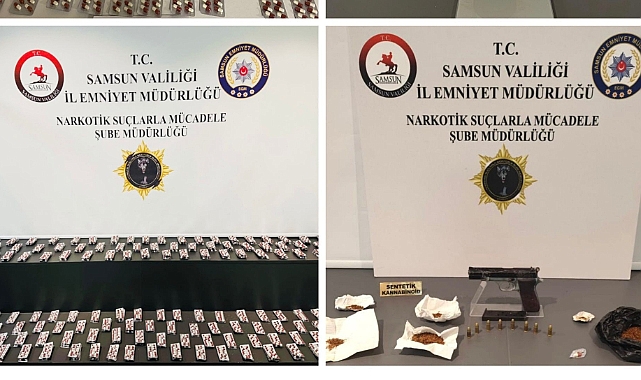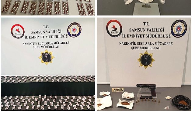 Edinilen bilgiye göre, Samsun Emniyet Müdürlüğü ekipleri il merkezi ve ilçelerde haksız kazanç sağlamak amacıyla, uyuşturucu madde ticareti, nakli veya depolanması faaliyetlerini yürüten şahıslara yönelik olarak çalışma yaptı. Yapılan çalışmalarda 10 bin 613 adet sentetik ecza, 120 gram metamfetamin, 10,67 gram esrar, 22,85 gram sentetik kannabinoid, 5 adet uyuşturucu kullanım aparatı, 1 adet ruhsatsız tabanca ve 8 adet tabanca fişeği ele geçirildi. Olayla ilgili yakalanan 33 kişi hakkında adli işlem başlatıldı. Ayrıca, 2 yıl 8 ay, 2 yıl 6 ay ile 1 yıl 8 ay kesinleşmiş hapis cezası bulunan 3 şahıs yakalandı.