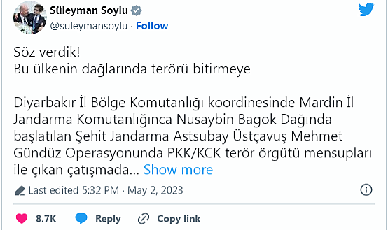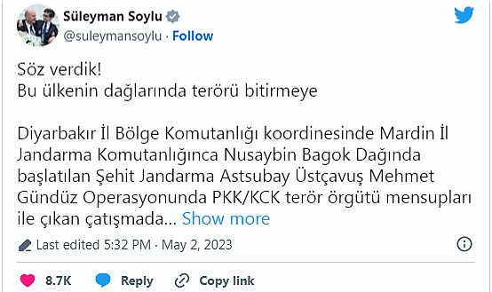 Diyarbakır İl Bölge Komutanlığı koordinasyonunda Mardin İl Jandarma Komutanlığınca Nusaybin Bagok Dağı'nda başlatılan "Şehit Jandarma Astsubay Üstçavuş Mehmet Gündüz Operasyonu"nda PKK/KCK'lı teröristlerle çıkan çatışmada 1 teröristin silahıyla etkisiz hale getirildiğini belirten Soylu, "Etkisiz hale getirilen teröristin, 28 Nisan'da yaşanan çatışmada kahraman jandarmamız Mehmet Gündüz'ü şehit eden terörist olduğu belirlendi." bilgisini verdi.