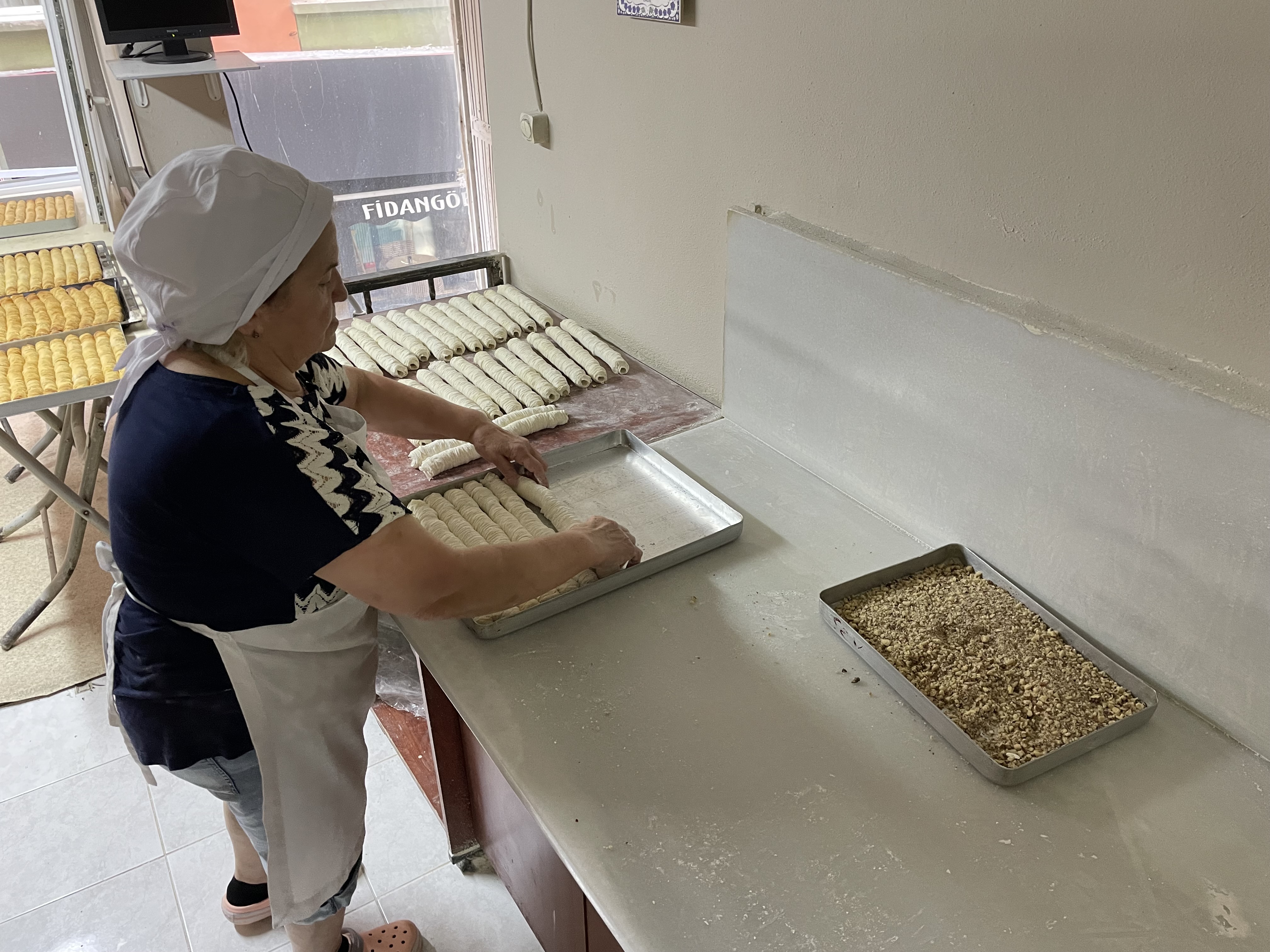 "Şimdi sabah 06.30, gece saat 11-12'ye kadar çalışıyoruz. Bazen sabahladığımız da oluyor. Burma tatlısı hiçbir zaman değerini yitirmiyor. Tatlı olarak başka çeşitler de yapıyoruz ama burma tatlısı olmazsa olmazlarımızdan, hatta demirbaşımız diyebiliriz. İnsanlar daha çok fındıklı burma tatlımıza ilgi gösteriyor. Biz mesela bayramlarda 150-200 tepsi fındıklı burma tatlısı yapıyorsak belki 10-15 tane cevizli yapıyoruz. Fındıklı burma tatlısına çok daha fazla talep var."