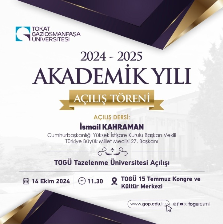 Tokat Gaziosmanpaşa Üniversitesi 2024-2025 Akademik Yılı Açılış Töreni için gün saymaya başladı. TOGÜ 15 Temmuz Kongre ve Kültür Merkezinde gerçekleşecek açılış töreninde açılış dersi için yer alacak ismi de Tokat Gaziosmanpaşa Üniversitesi duyurdu.