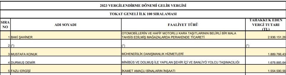 Tokat Defterdarlığının açıkladığı verilere göre 2023 Vergilendirme yılında Gelir Vergisinde 2.936.151,26 TL tahakkuk eden vergi ile Baki Şahiner vergi rekortmeni oldu. İkinci sırada yer alan mükellef yine isminin açıklanmasını istemezken, 3. sırayı 1.889.766,43 TL ile Mustafa Konuk, 4. sırayı 1.78.885,64 TL ile Durmuş Demir ve 5. sırayı ise 1.554.590,56 TL Fazlı Ergişi aldı.
