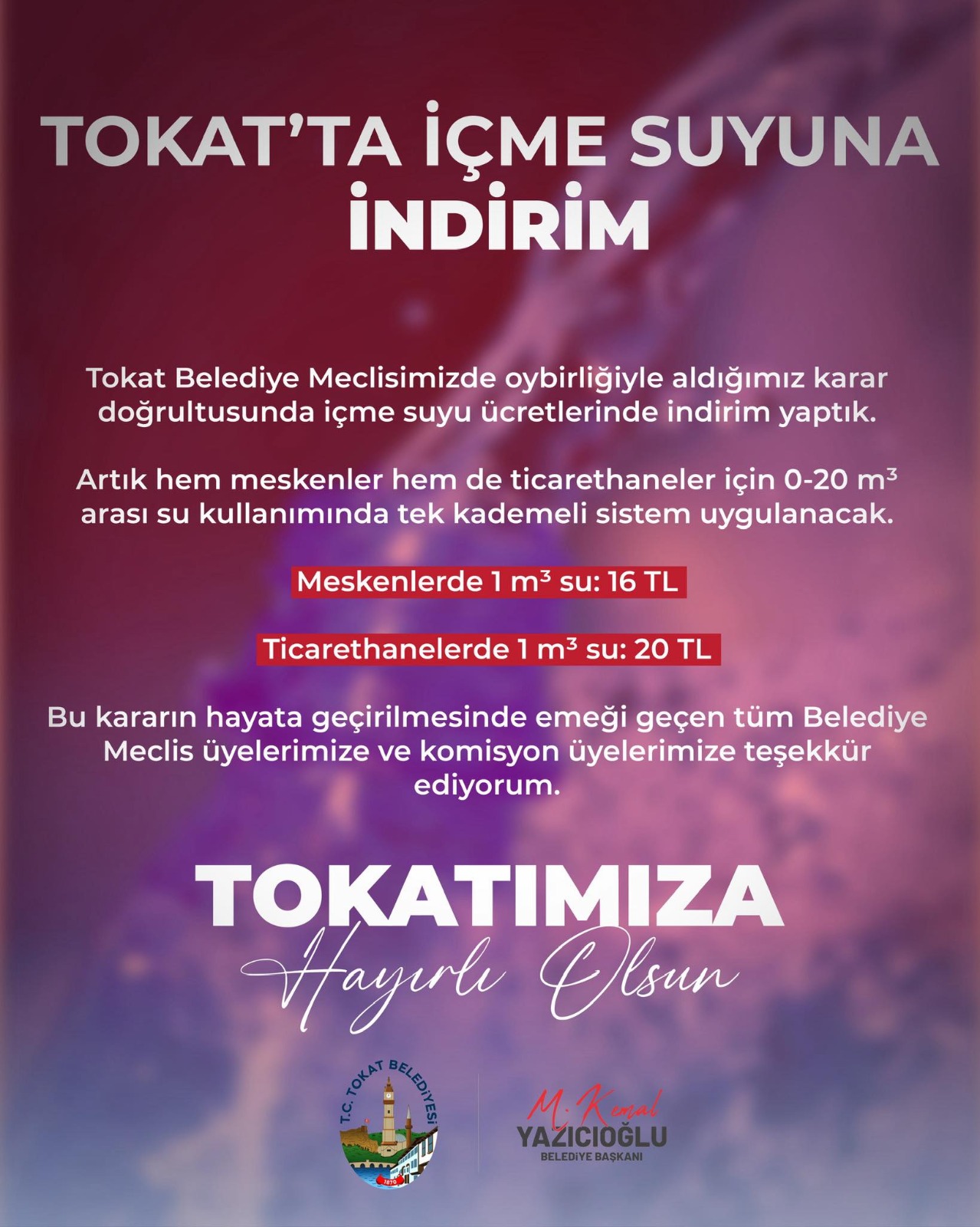 Tokat Belediye Meclisi’nin Ağustos ayı toplantısında alınan karar doğrultusunda içme suyu ücretlerinde indirime gidildi. Belediye Başkanı Mehmet Kemal Yazıcıoğlu, üretken belediyecilik anlayışıyla hayata geçirilen düzenlemenin vatandaşların bütçesine doğrudan katkı sağlayacağını söyledi.
