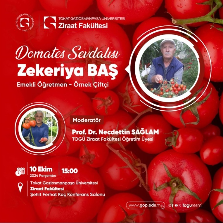 Niksar’ın Çamiçi Yaylasında 40 m2 kadar bir alanda domates yetiştiriciliği yapan Emekli Öğretmen Zekeriya Baş, domates yetiştiriciliği ve tarım konusundaki bilgi-deneyimlerini Ziraat Fakültesi öğrencileri ile paylaşmaya hazırlanıyor. 2000’li yılların başından bugüne kadar domates yetiştiriciliğinde önemli tecrübeler elde eden ve kendisini tarım konusunda geliştiren Zekeriya Baş 10 Ekim 2024 tarihinde Tokat Gaziosmanpaşa Üniversitesi’nin Ziraat Fakültesi öğrencileri ile buluşacak.