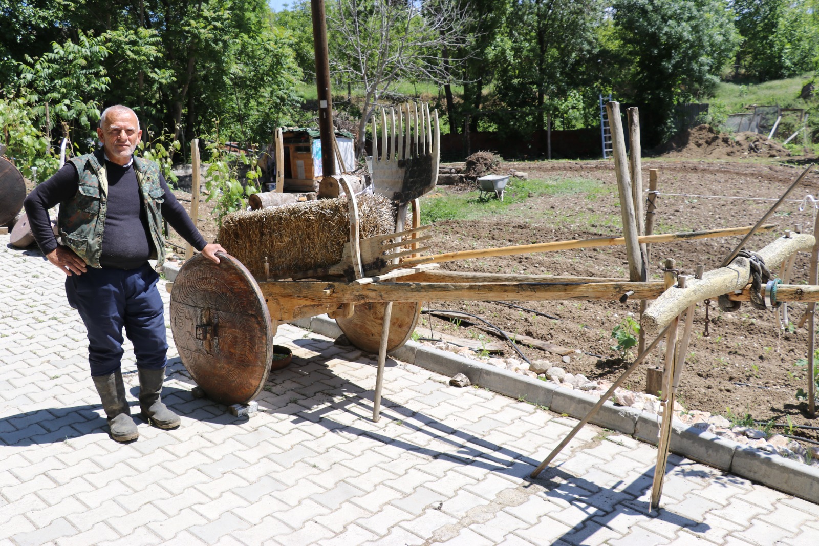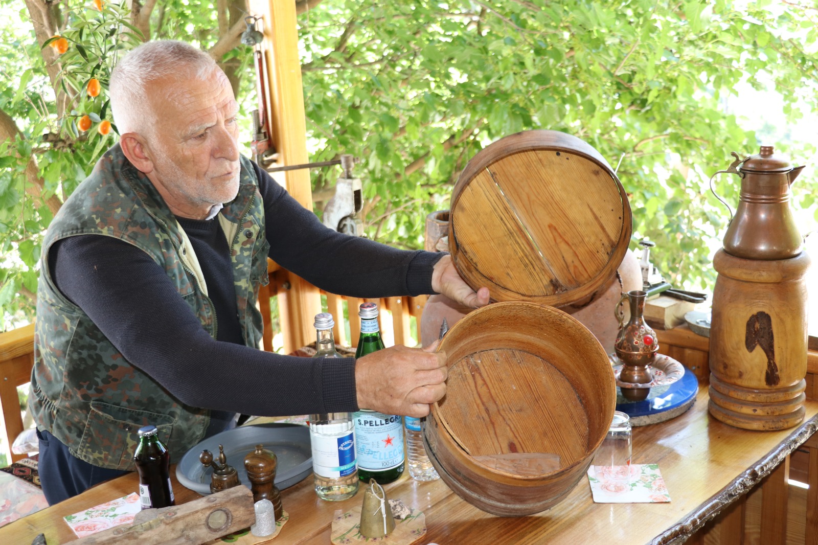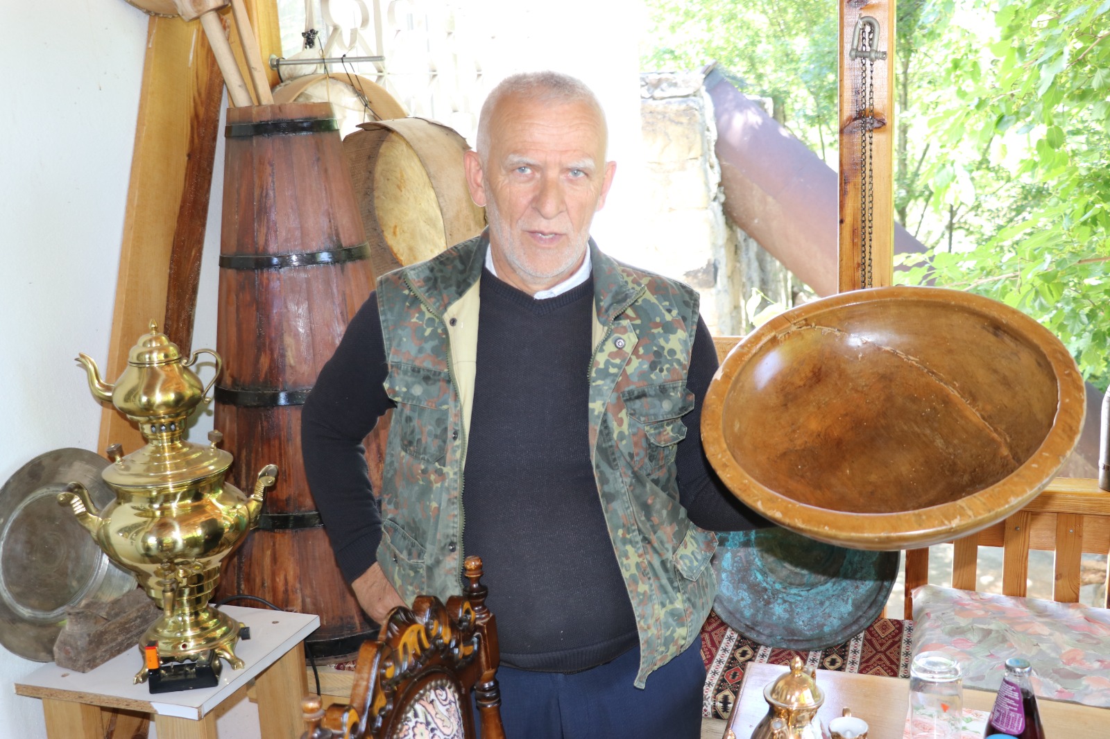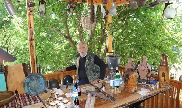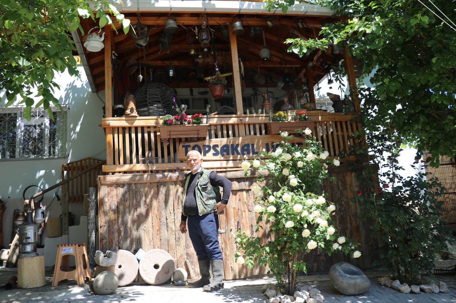 Bazılarının geçmişi 250 yılı bulan mutfak eşyası, ziraat aletleri, ev eşyaları, kağnı, at arabası, değirmen taşı gibi çok sayıda objeyi evinin bahçesinde ve terasında sergileyen Topsakal, keyifle gezdirdiği ziyaretçilerine ikramda da bulunuyor.