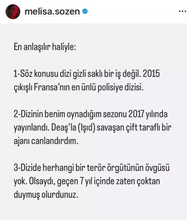 Melisa Sözen, emniyette verdiği ifadede, "Giydiğim kıyafetin böyle bir örgütü simgelediğini bilmiyordum. Ben 'ajan' rolünde oynuyordum. Dizi Türkiye'de yayınlanmadı. Vatanımı ve milletimi seven birisiyim" ifadelerini kullandı.